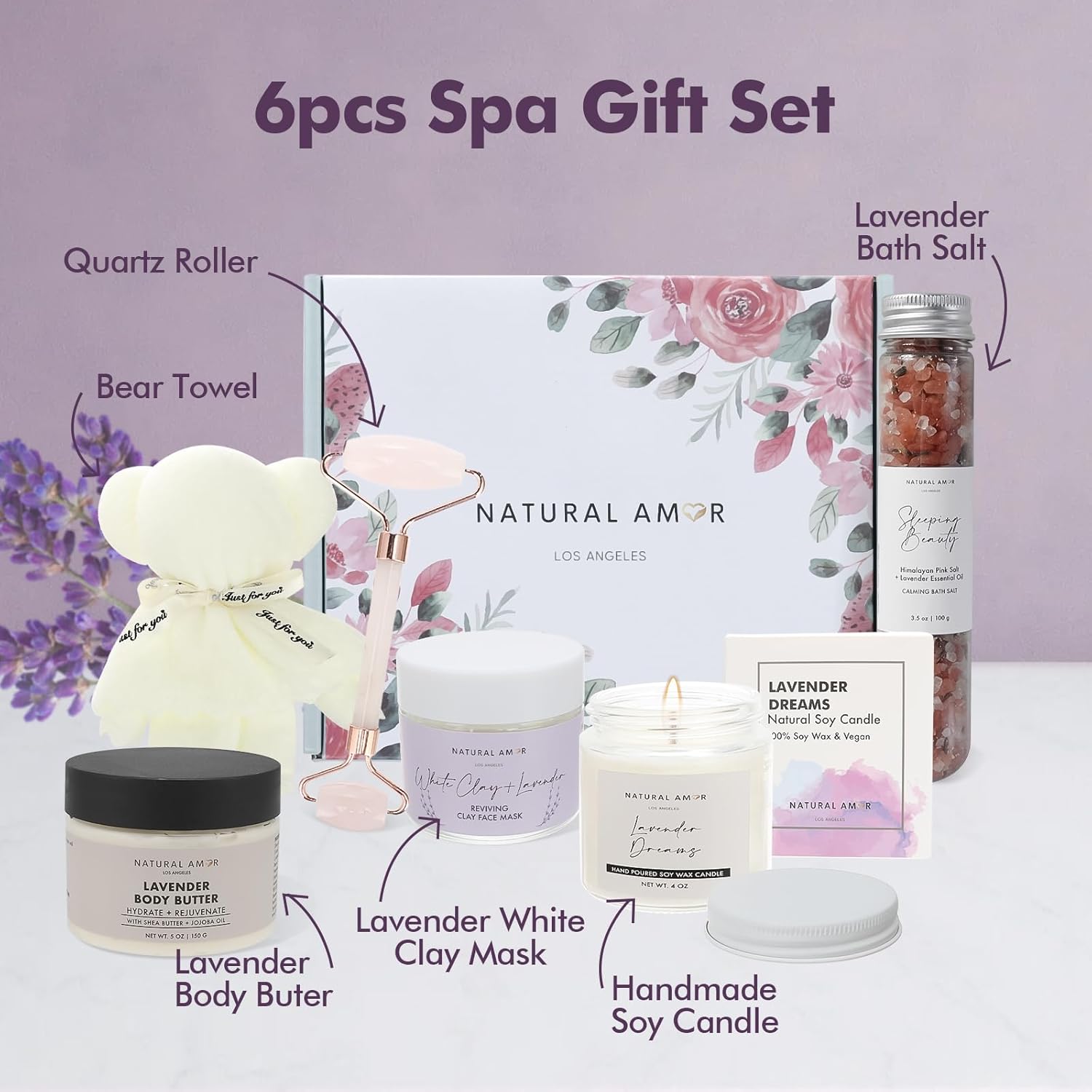 - Complete 6-Piece Spa Gift Set: Includes Lavender Body Butter, Bath Salt, Lavender White Clay Face Mask, Lavender Candle, Pink Quartz Roller, and a Soft Bear Towel.