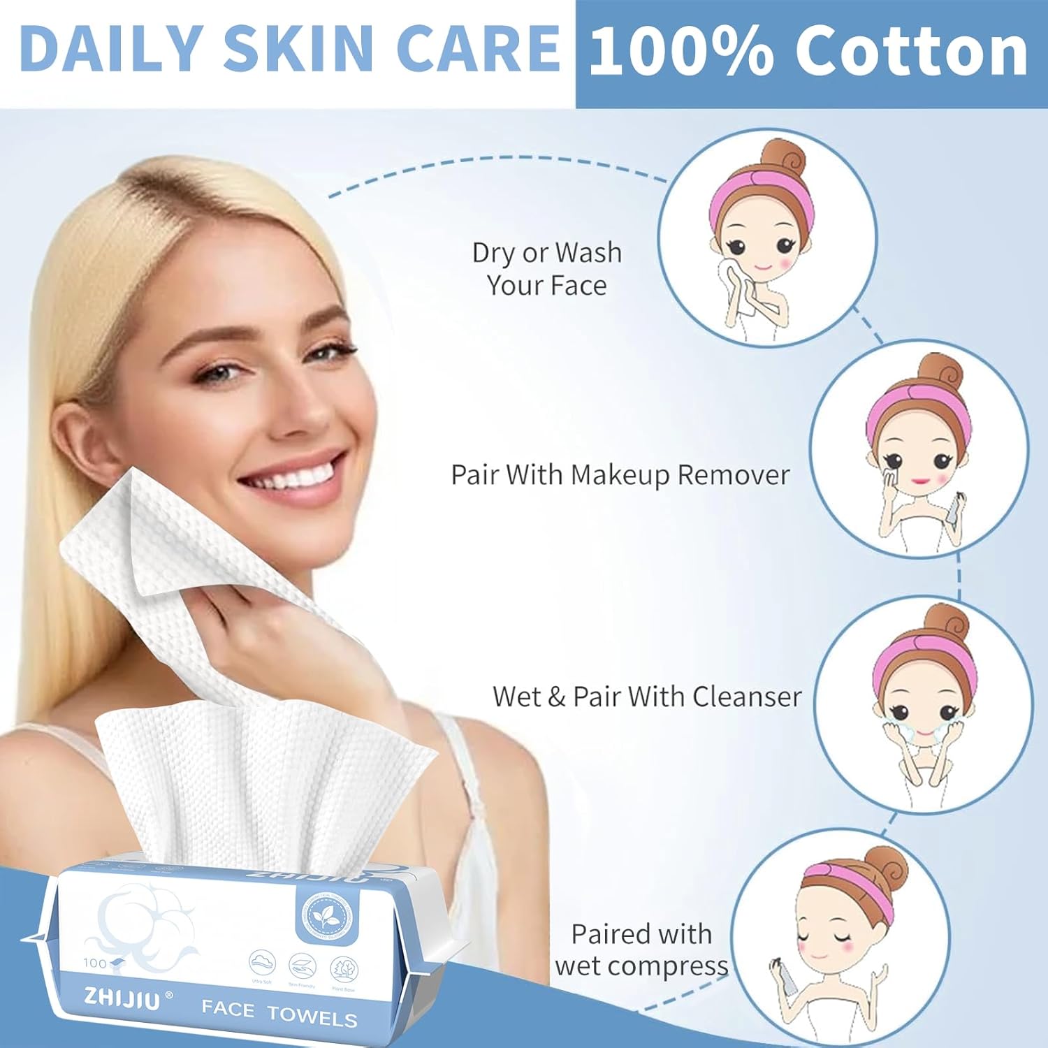 Disposable Face Towels 200 Count, Lint-Free Soft Cotton Facial Dry Wipes,8” x 8” Clean Facial Towels Wash Cloth for Sensitive Skin,Makeup Remover Dry Wipes