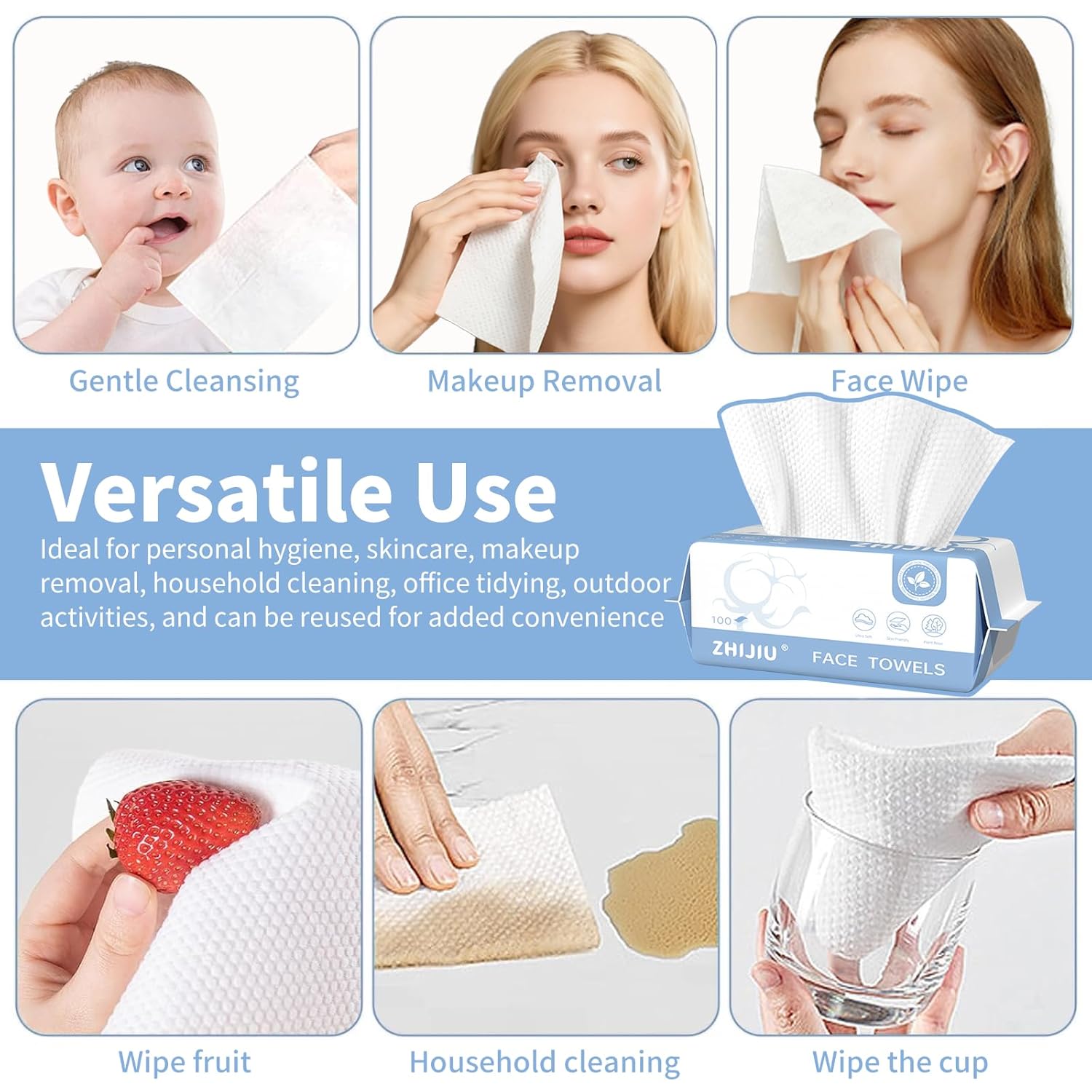 - Dry/Wet Multi-Use Disposable Face Towels: Strong, absorbent, and won't tear like paper. Use dry for baby care or cleaning electronics; dampen for makeup removal or household cleaning. Washable and reusable 2-3 times.