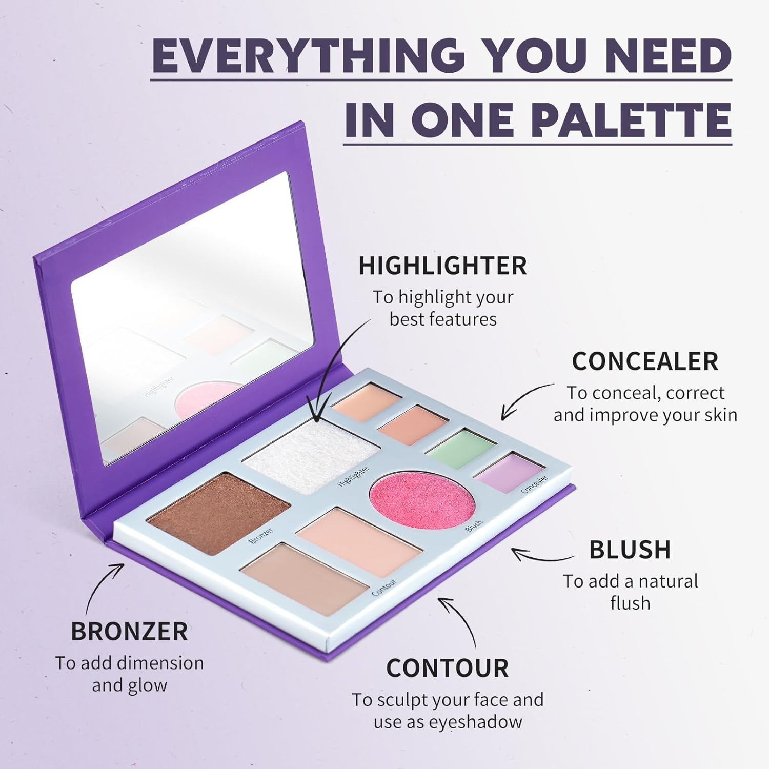 - Contour Blush Highlighter Palette: Features 9 shades including 1 shimmery highlighter, 2 shimmery blush and bronzer, 2 matte contour powders, and 4 creamy concealers - everything you need for a complete face makeup look in one sleek compact makeup palette. The curated shade range allows you to sculpt, highlight, and color-correct with seamless harmony across all your features.