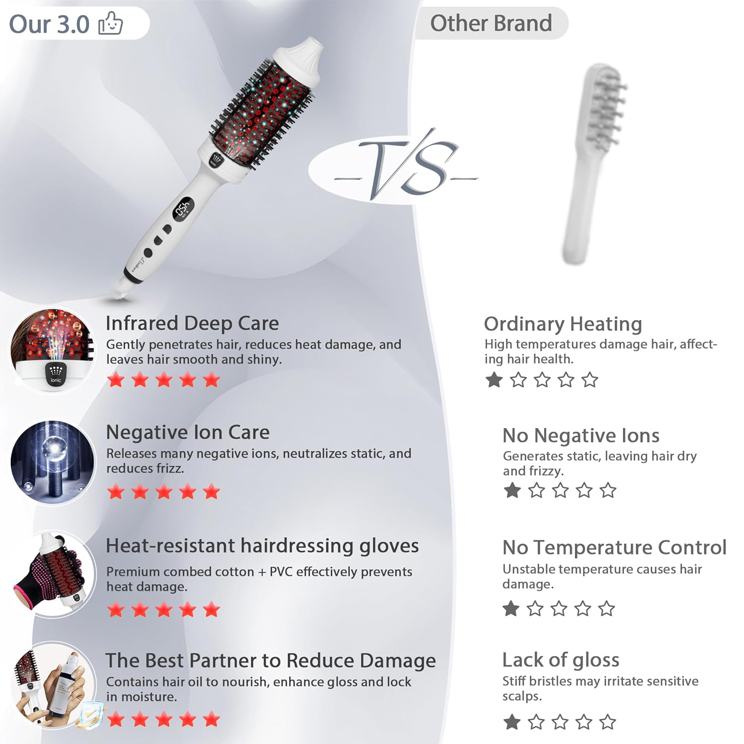 - [Infrared Deep Care Combined With Negative Ion Anti-Frizz] The Infrared Roller Brush utilizes advanced Infrared heating technology that gently penetrates the hair to reduce high-temperature damage while releasing negative ions to neutralize static electricity, reduce frizz, and make hair smoother, softer and more shiny. Note: Our product is not a hair dryer brush, nor an automatic curling iron, you need to curl your hair manually.