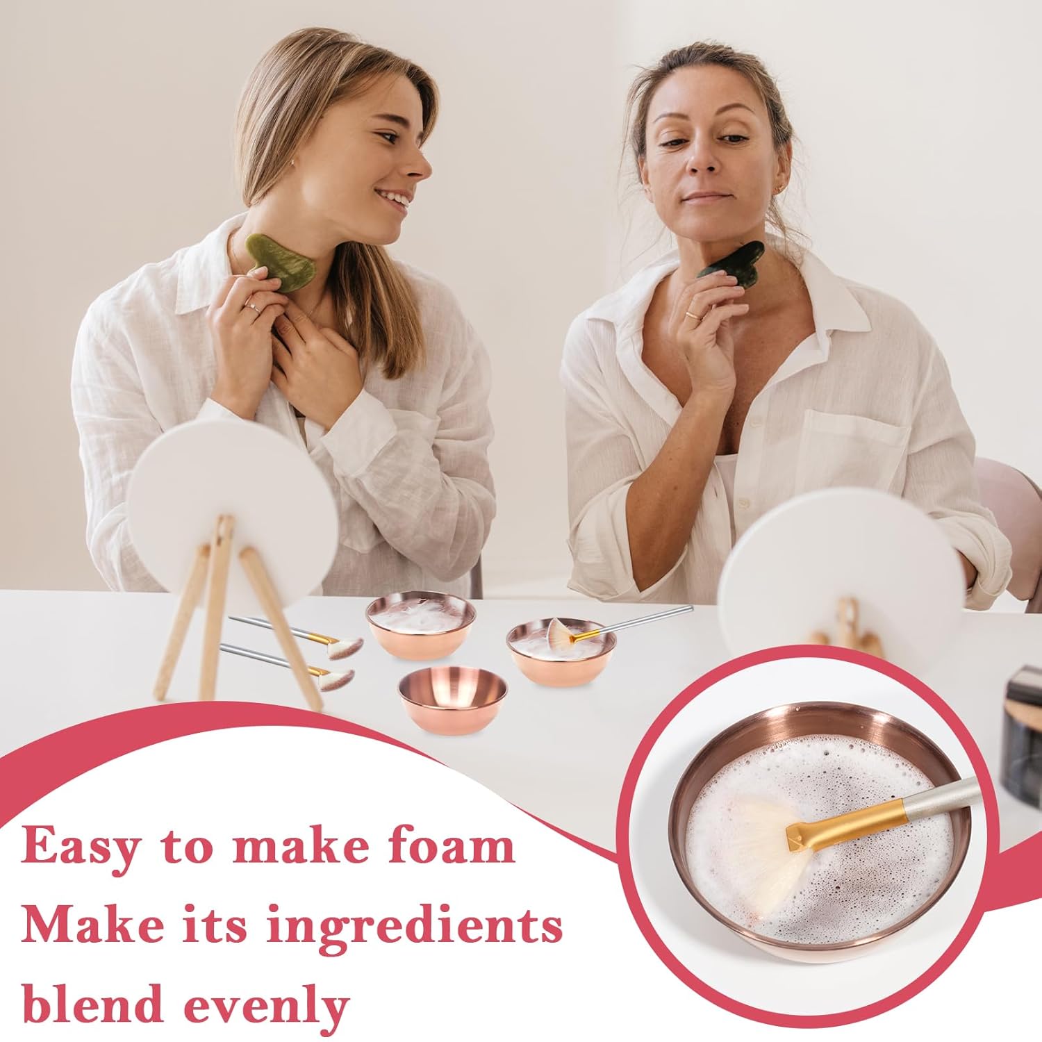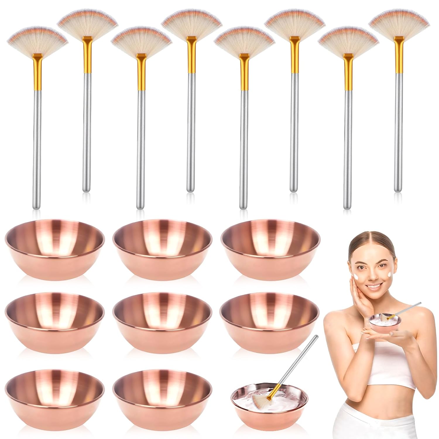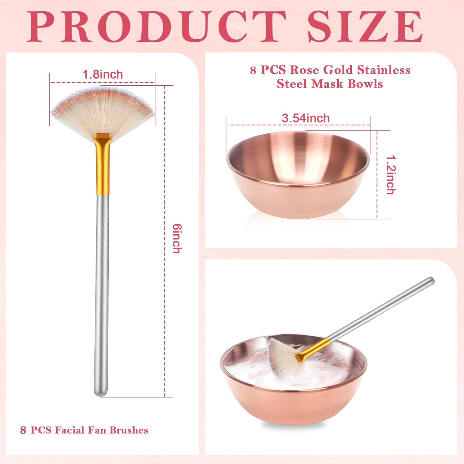 - 1.Rose Gold supplies for facials: This 16-piece rose gold beauty tool set includes 8 durable, stainless steel mask bowls measuring 3.54x1.2 inches, designed to enhance your skincare routine. Additionally, it features 8 fan-shaped makeup brushes, each 6x1.8 inches, perfect for stirring, applying masks, and large-area makeup. The elegant rose gold finish adds a touch of sophistication to your beauty ritual, making it both functional and stylish.