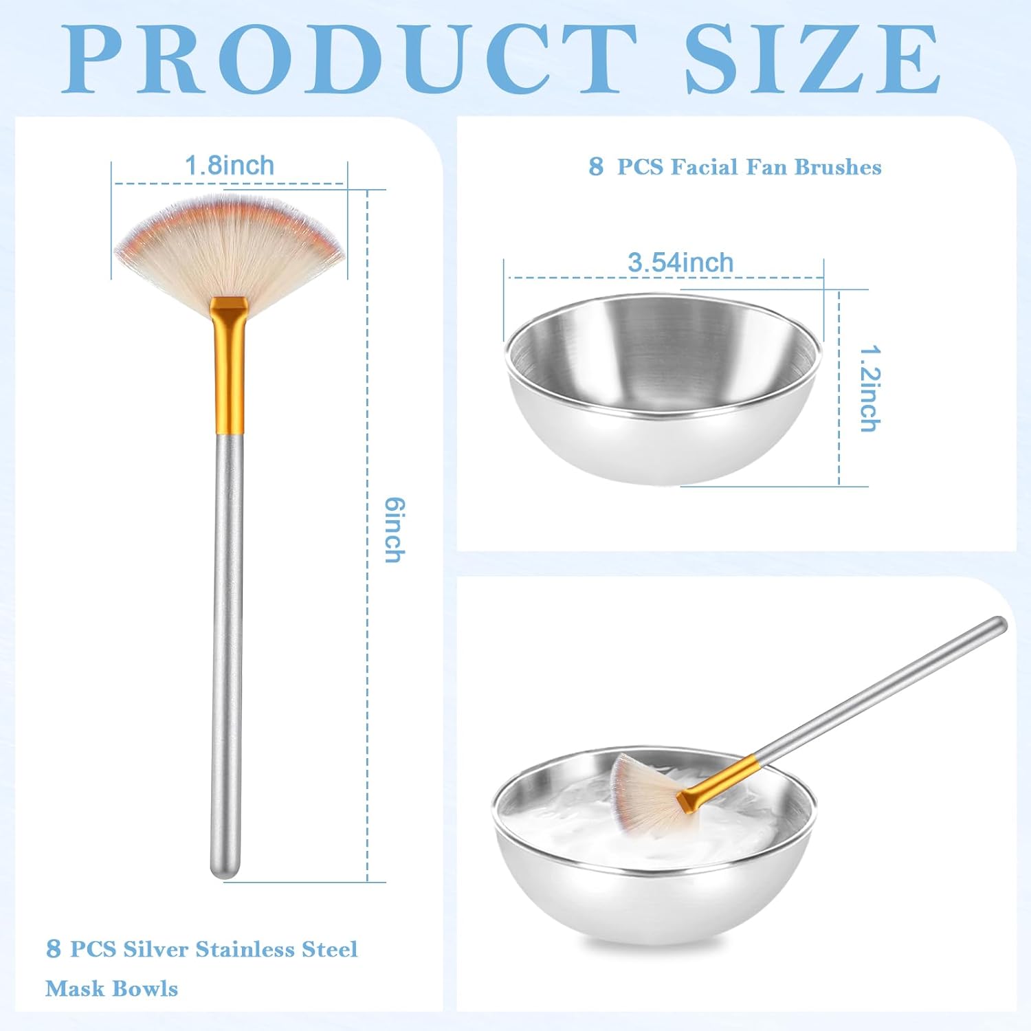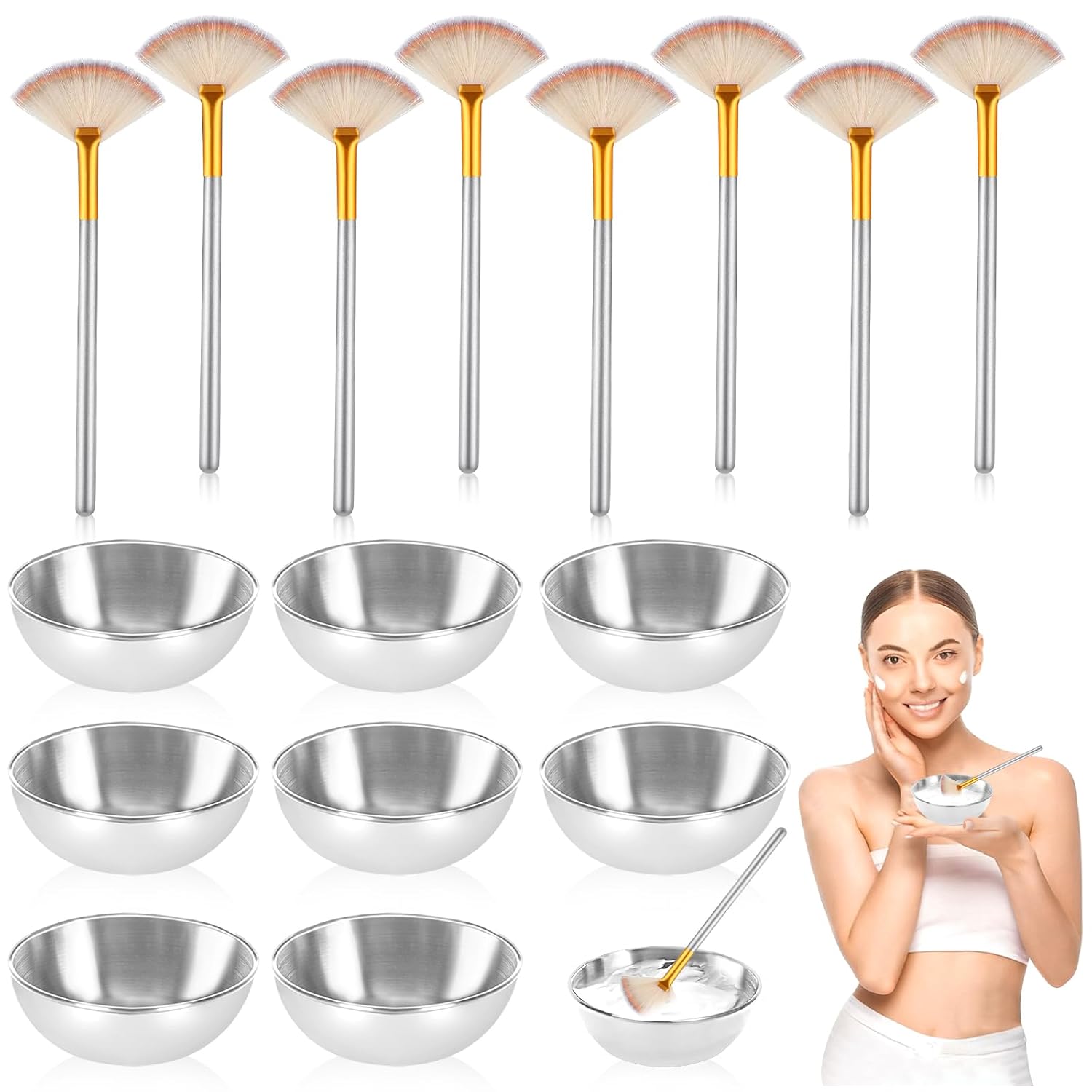 - 1.Silver supplies for facials: This 16-piece silver beauty tool set includes 8 durable, stainless steel mask bowls measuring 3.54x1.2 inches, designed to enhance your skincare routine. Additionally, it features 8 fan-shaped makeup brushes, each 6x1.8 inches, perfect for stirring, applying masks, and large-area makeup. The elegant silver finish adds a touch of sophistication to your beauty ritual, making it both functional and stylish.