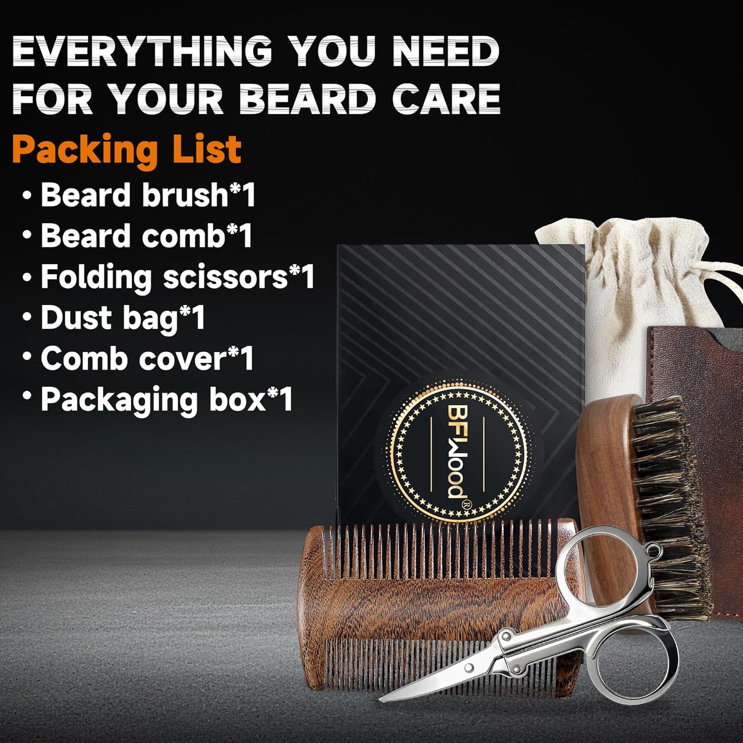 BFWood Mens Beard Brush Comb Kit: Small Travel Beard Set - Natural Boar Bristles With Black Walnut Wood, Grooming Sandalwood Mustache Comb, Mustache Trimming Sissors With Storage Bag