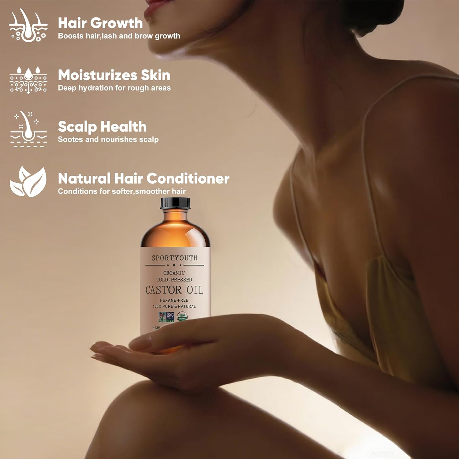 - CERTIFIED ORGANIC PURITY & QUALITY - Experience SPORTYOUTH usa made, USDA certified organic castor oil. This premium carrier oil is 100% pure, cold-pressed, hexane-free, cruelty-free, Non-GMO, no fragrance, odorless, no additives or contaminants. Perfect for those seeking a clean, natural, multipurpose, organic skincare solution
