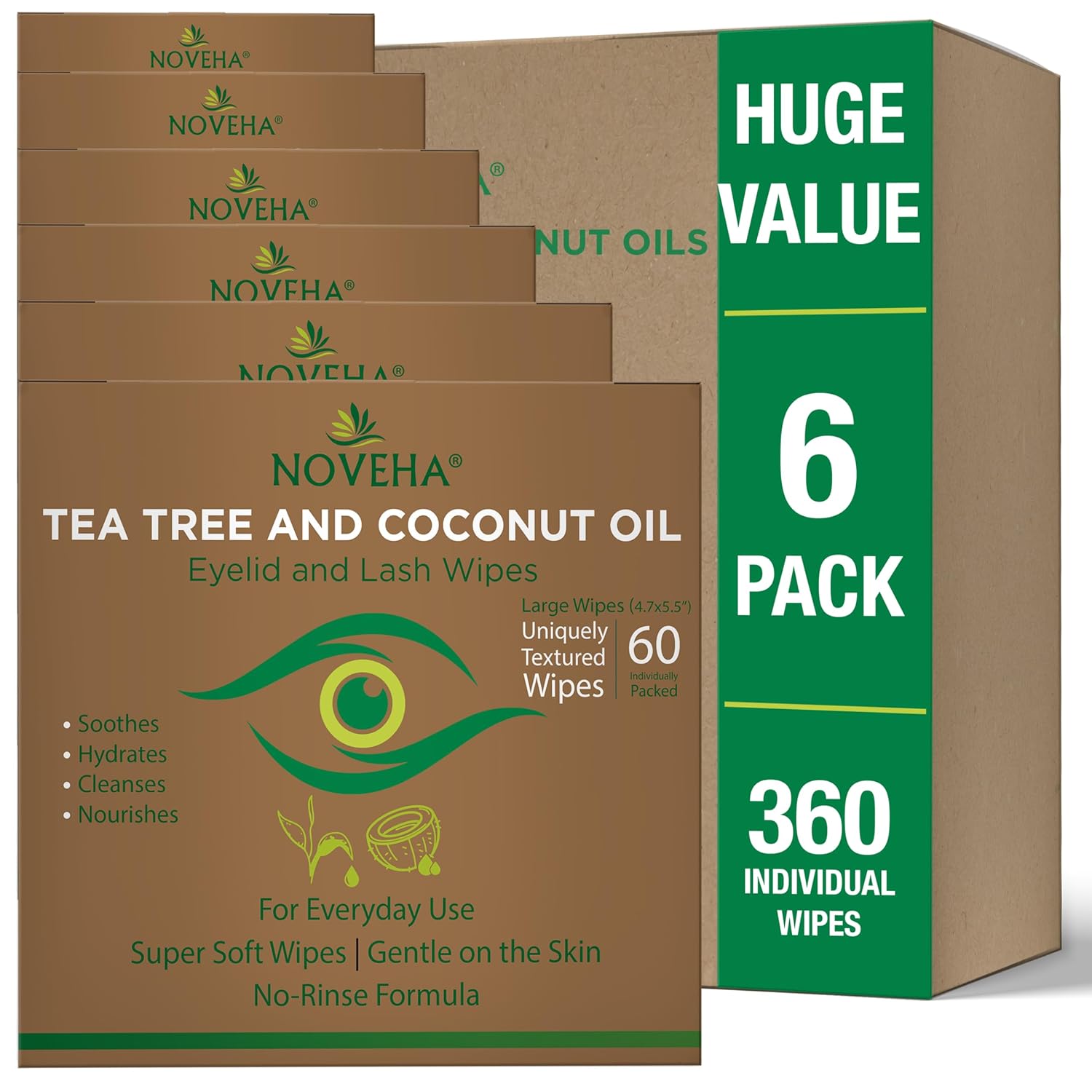 NOVEHA 360PCs Tea Tree & Coconut Oil Eyelid & Lash Wipes | For Demodex, Blepharitis & Itchy Eyes, Box Of 60 Individually Wrapped Eyelash Wipes With Aloe Vera, Natural Makeup Remover