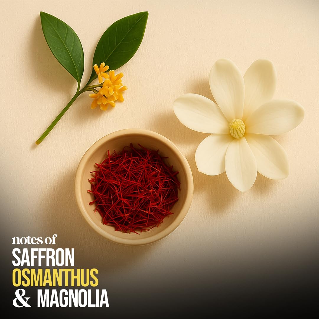 - π£π¨π₯π ππ₯πππ₯ππ‘ππ π£ππππ’πͺ π£π₯ππ‘πππ¦π¦ :Experience the smooth and gentle blend of Saffron, Osmanthus, and Magnolia that makes your senses bloom. The heart of the perfume shines with Tuberose and Passionfruit, bringing a warm and romantic feeling. The base of Patchouli, Madagascar Vanilla, and Musk leaves a creamy, soft trail that lasts for hours.