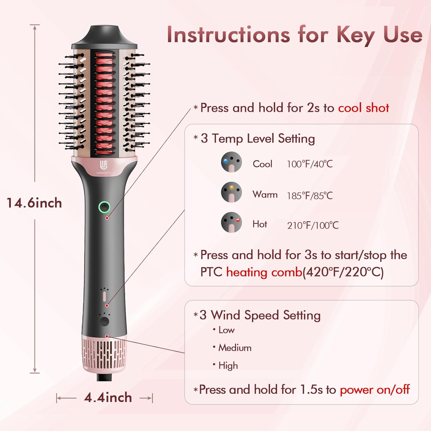 - All In One Hair Styler: Our advanced unique design hair dryer brush and heated straightening comb in one. Switch seamlessly between different modes with one button. Whether you're smoothing frizz, straightening strands, or creating bouncy curls, this 2-in-1 hot air & straightening brush gives you salon-worthy results. Create hairstyle without multiple tools