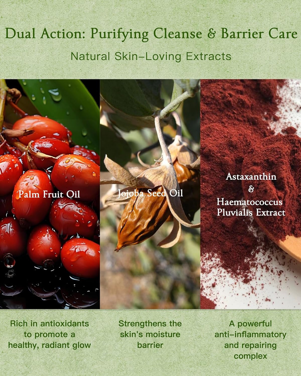 - Skin Barrier Care While Cleansing 🌿 Infused with 12 natural skin-nurturing extracts, including Palm Fruit Oil, Jojoba Seed Oil, and Astaxanthin & Haematococcus Pluvialis Extract, this cleansing balm gently removes makeup while protecting and strengthening the skin’s natural barrier.